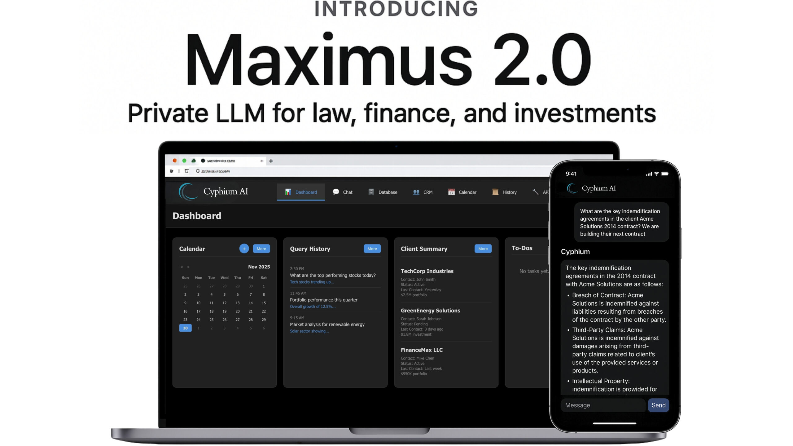Maximus 2.0 is Cyphium’s latest private intelligence system built specifically for law, finance, and investment banking. It ingests your documents, understands your matters, and gives you instant, accurate answers, briefs, analysis, diligence, summaries, prep work, and risk flags — all inside a secure private environment. Cyphium’s proprietary NeuroCast links directly to Salesforce and Google Calendar, giving Maximus real-time context for sharper, faster, more accurate answers.