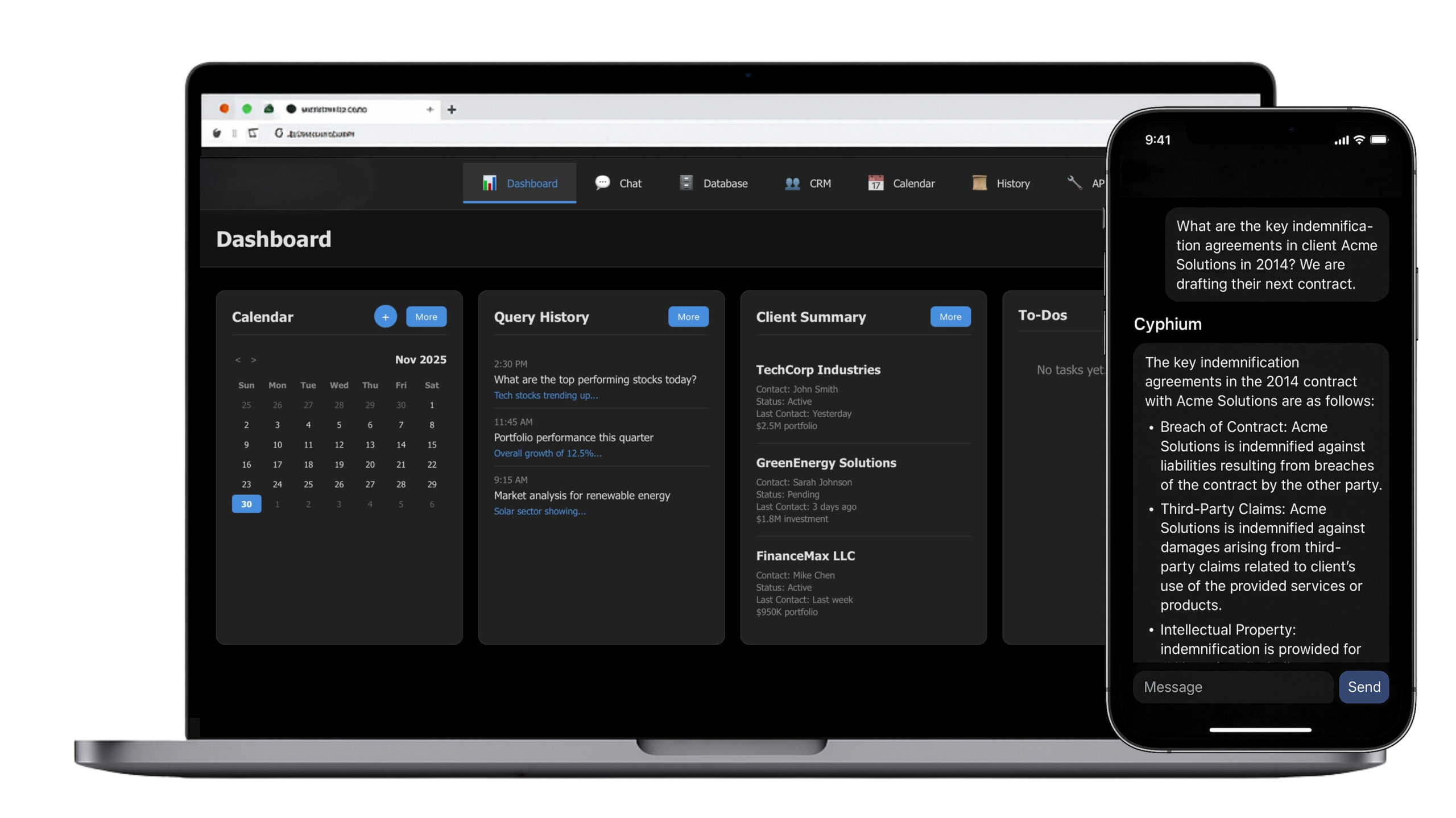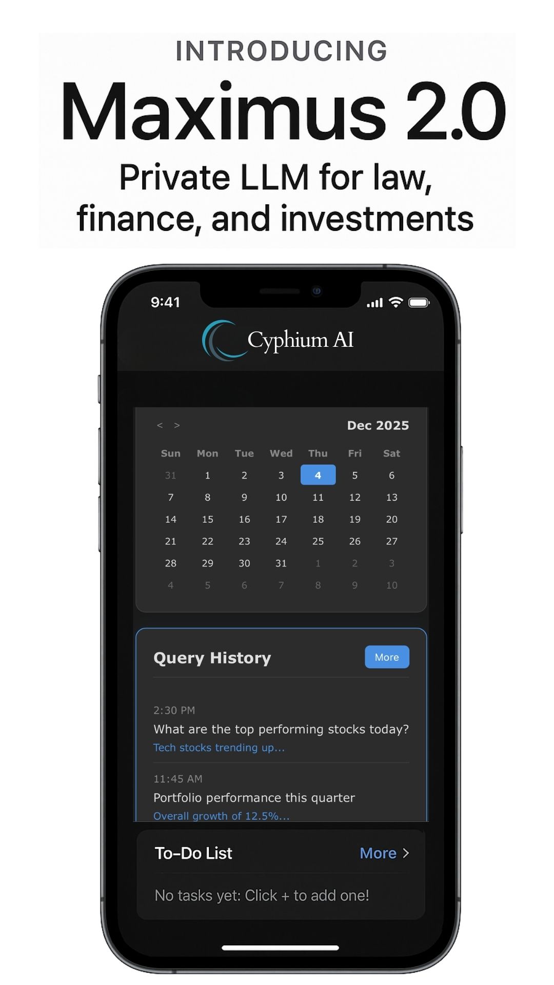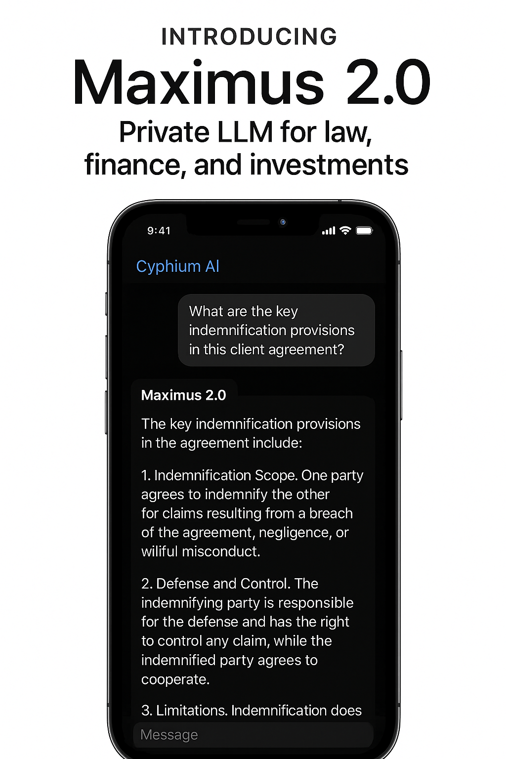 Maximus 2.0 is Cyphium AI’s private intelligence platform built for law firms, financial teams, and investment organizations. It runs inside a secure, dedicated environment and connects directly to your internal documents, systems, and workflows.